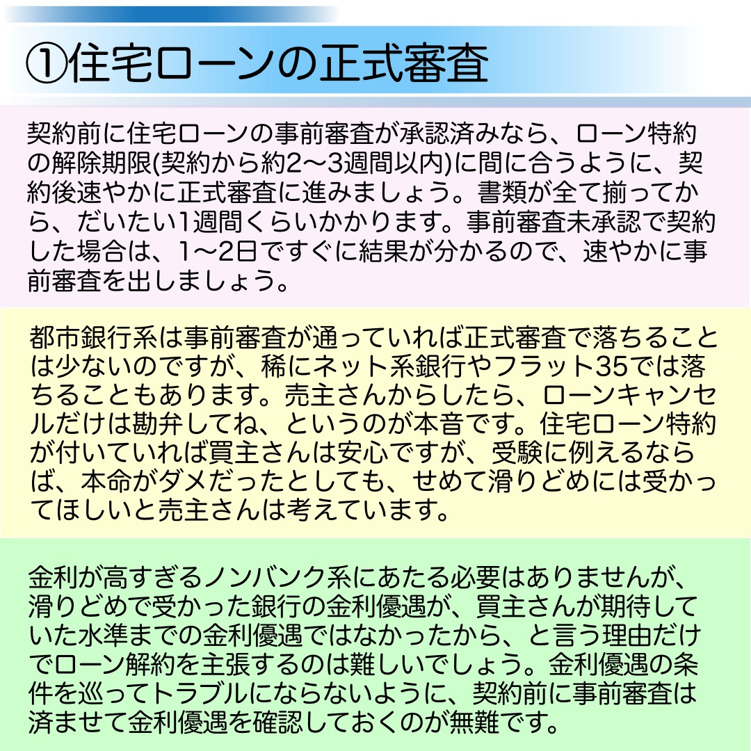 完成済の新築建売を購入した場合、一般的には契約日の約1か月後に引き渡しとなります。①~⑤の作業を1ヶ月に凝縮して行うため、この1か月間はかなり慌ただしくなると思っていて下さい。