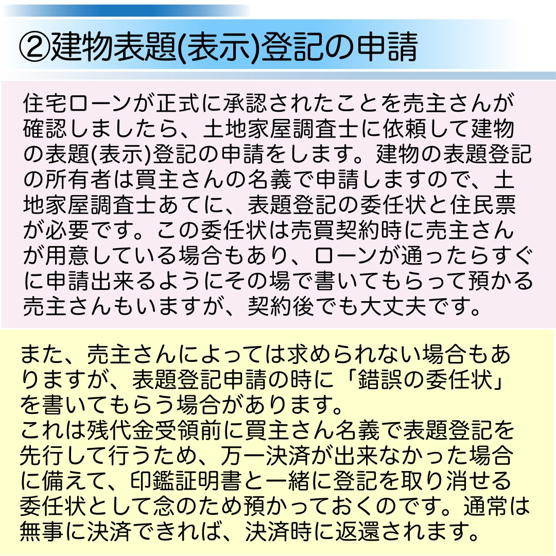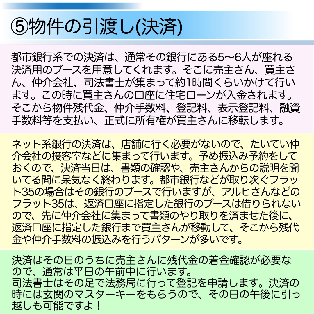 ちなみに、中古物件の購入の場合は、①~⑤の内、②の建物表題(表示)登記は必要ありません。また、④についても、隣地との境界の確認などは行いますが、引渡し前の立会い(キズの確認)は、現況有姿のため、行わないことが多いです。