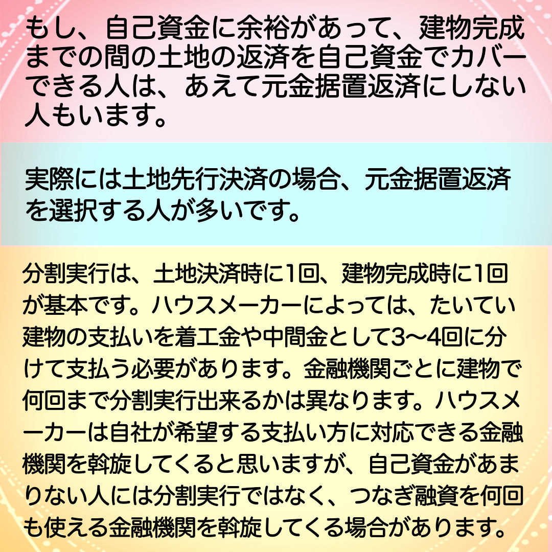 ハウスメーカーで建てる場合、ある程度自己資金に余裕がある方であれば、土地の決済(1回目の融資実行)の段階では元金据置返済を選んでなるべく多めに借りておいて、その後の建物の建築中に発生する何回かの支払い分を自己資金から支払いができると、つなぎ融資を使わずに通常の2回の分割実行でいけるのでスムーズかもしれません。
